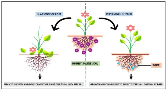 Plant growth-promoting microorganisms are a certain class of microorganisms that aid the plant’s growth either directly or indirectly. In contrast, the bacterial species aiding plant growth present at the rhizosphere are known as plant growth-promoting rhizobacteria (PGPR) [16]. The enzyme ACC deaminase produced by PGPR acts as a sink for 1-aminocyclopropane-1-carboxylic acid (ACC, which is an immediate biosynthetic precursor of ethylene), helping to lower the plant’s ethylene levels [17,18,19,20]. The metabolism of ACC by the action of this enzyme is the primary mechanism of PGPR to alleviate abiotic stresses, including salinity stress in plants [21]. The use of PGPR for aiding salinity stress tolerance is a highly beneficial green method that helps to increase plant growth and productivity [22]. Based on the importance of salinity, the present review summarizes (i) the effect of salinity stress in plants, (ii) how the plants try to withstand the salinity stress conditions, (iii) how the ethylene concentration increases during salinity stress and (iv) the mechanism of action through which PGPR alleviate salinity stress by producing ACC deaminase enzyme.