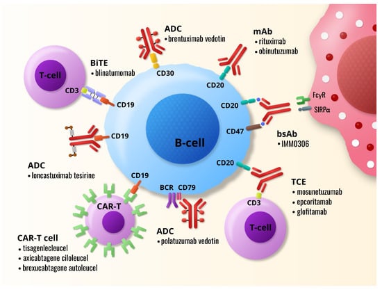 Our review is focused on the current role of ADCs and bsAbs in B-NHL and CLL treatment. We discuss mechanism of action specific for each class, point to differences in their serious treatment-related toxicities and give an overview of the most important preclinical and clinical trials. Figure 1 shows examples of some immunotherapeutic agents used in B-NHLs.