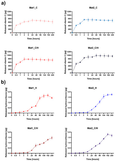 The vitamin C and hydrocortisone release from the curdlan-based biomaterials was evaluated over 10 days using drug release USP4 Sotax apparatus with a closed-loop system (Figure 1). It was observed that the developed biomaterials exhibited higher and faster vitamin C profile release than hydrocortisone. As shown in Figure 1a, the Mat1_C/H and Mat2_C exhibited burst release of the vitamin C within the first 3 h, whereas Mat1_C within 24 h and Mat2_C/H released vitamin C until 48 h, then showed a plateaued release of vitamin C. Interestingly, Mat2_C/H released a noticeably greater amount of vitamin C (approx. 985 µg) compared to other biomaterials modified with vitamin C (in the range of 704–772 µg). The burst release of vitamin C from biomaterials is a good property since it may cause rapid scavenging of ROS what has a beneficial impact on the proper healing of chronic and burn wounds, which are characterized by the overproduction of these species [24]. Unlike vitamin C, curdlan-based biomaterials modified with hydrocortisone displayed slow and gradual release of hydrocortisone (Figure 1b). Apart from Mat1_C/H, all hydrocortisone-enriched biomaterials (Mat1_H, Mat2_H and Mat2_C/H) achieved plateau in hydrocortisone release after 192 h (8 days). Importantly, all biomaterials released similar amount of hydrocortisone (approx. 1.75 µg).