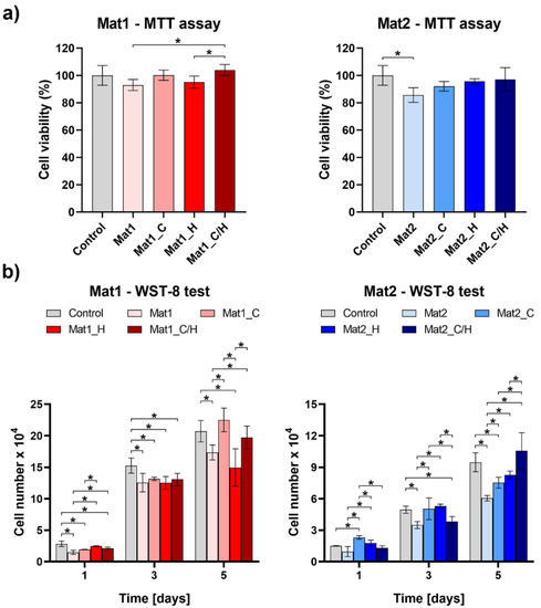 Dressings for wound healing treatment should be biocompatible to avoid irritation and allergic skin response [27]. The cytotoxicity test was conducted in accordance with the procedure described in ISO 10993-5 standard using MTT assay. The test revealed that produced curdlan-based biomaterials were non-toxic to human fibroblasts (BJ cell line) (Figure 2a). Cell viability after exposure to 24-h extracts of biomaterials was above 85% compared to the control cells exposed to polystyrene extract. Moreover, statistically significant increase in cell viability was observed after exposure to extract of Mat1_C/H compared to extracts of Mat1 and Mat1_H. Extract of Mat1_C also increased cell viability compared to Mat1, but no statistically significant differences were reported. It indicates that released vitamin C from Mat1_C and Mat1_C/H had positive effect on fibroblast viability. Although enrichment of Mat2 with vitamin C and hydrocortisone also had a positive effect on cell viability, no statistically significant results were observed.