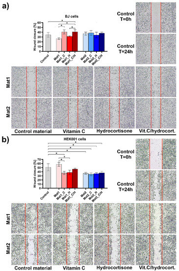 Cell migration after exposure to the extracts of biomaterials: (a) migration of human skin fibroblasts (BJ cell line) and (b) migration of human epidermal keratinocytes (HEK001 cell line) (control–cells maintained in the presence of polystyrene extract); * statistically significant results between indicated groups, n = 3, p < 0.05, one-way ANOVA followed by Tukey’s test (Mat1: curdlan/agarose biomaterial, Mat2: curdlan/chitosan biomaterial, C–vitamin C, H–hydrocortisone, C/H–mixture of vitamin C and hydrocortisone, T = 0 h–wound surface just after scratching, T = 24 h–wound surface 24 h after scratching).