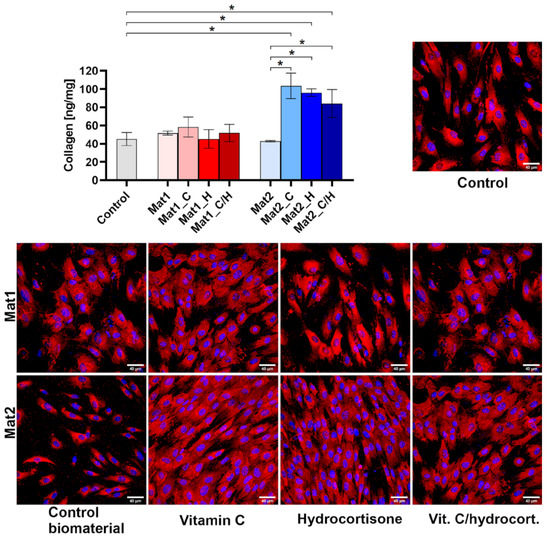 Quantitative (ELISA) and qualitative (immunofluorescence staining) assessment of type I collagen synthesis by human fibroblasts (BJ cell line) after culture in the presence of biomaterials (control–cells culture in the inserts without biomaterial, images: collagen–red fluorescence, nuclei–blue fluorescence, magnification 200×, scale bar = 40 µm); * statistically significant results between indicated groups, p < 0.05, one-way ANOVA followed by Tukey’s test (Mat1: curdlan/agarose biomaterial, Mat2: curdlan/chitosan biomaterial, C–vitamin C, H–hydrocortisone, C/H–mixture of vitamin C and hydrocortisone).