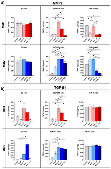 ELISA evaluation of (a) MMP-2 and (b) TGF-β1 levels in human skin fibroblasts (BJ cell line), epidermal keratinocytes (HEK001 cell line), and macrophages (derived from THP-1 cell line) cultured in the presence of biomaterials (control–cells culture in the inserts without biomaterial); * statistically significant results between indicated groups, p < 0.05, one-way ANOVA followed by Tukey’s test (Mat1: curdlan/agarose biomaterial, Mat2: curdlan/chitosan biomaterial, C–vitamin C, H–hydrocortisone, C/H–mixture of vitamin C and hydrocortisone, ND–not detected).