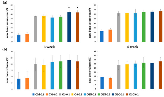 Figure 1. Evaluation of bone formation via radiological analysis and histomorphometric analysis. (a) radiological analysis; (b) histomorphometric analysis. rhBMP-2, recombinant human bone morphogenetic protein 2; BCP, biphasic ceramic phosphate scaffold; *, At the same concentration of rhBMP-2, bone formation occurred to a greater extent in BCP collagen than in BCP block and BCP powder at 3 weeks POD (p < 0.05); CM-0.1, no graft containing 0.1 mg/mL rhBMP-2; CM-0.2, no graft containing 0.2 mg/mL rhBMP-2; O3-0.1, BCP powder containing 0.1 mg/mL rhBMP-2; O3-0.2, BCP powder containing 0.2 mg/mL rhBMP-2; O3B-0.1, BCP block containing 0.1 mg/mL rhBMP-2; O3B-0.2, BCP block containing 0.2 mg/mL rhBMP-2; O3C-0.1, collagen-added BCP containing 0.1 mg/mL rhBMP-2; O3C-0.2, collagen-added BCP containing 0.2 mg/mL rhBMP-2.