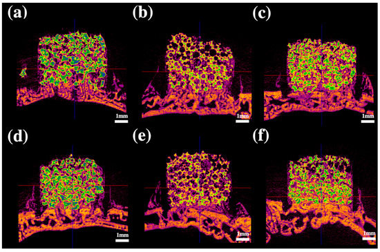 Figure 2. Radiological analysis after 3 weeks. (a) BCP powder containing 0.1 mg/mL rhBMP-2; (b) BCP block containing 0.1 mg/mL rhBMP-2; (c) collagen-added BCP containing 0.1 mg/mL rhBMP-2; (d), BCP powder containing 0.2 mg/mL rhBMP-2; (e), BCP block containing 0.2 mg/mL rhBMP-2; (f), collagen-added BCP containing 0.2 mg/mL rhBMP-2; BCP, biphasic ceramic phosphate scaffold; rhBMP-2, recombinant human bone morphogenetic protein 2.