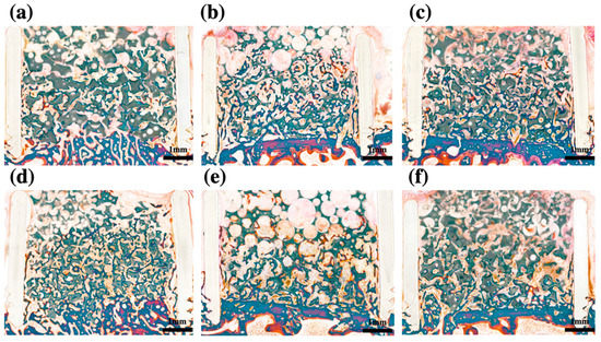 Figure 3. Histomorphometric analysis after 3 weeks. (a) BCP powder containing 0.1 mg/mL rhBMP-2; (b) BCP block containing 0.1 mg/mL rhBMP-2; (c) collagen-added BCP containing 0.1 mg/mL rhBMP-2; (d), BCP powder containing 0.2 mg/mL rhBMP-2; (e), BCP block containing 0.2 mg/mL rhBMP-2; (f), collagen-added BCP containing 0.2 mg/mL rhBMP-2; BCP, biphasic ceramic phosphate scaffold; rhBMP-2, recombinant human bone morphogenetic protein 2.