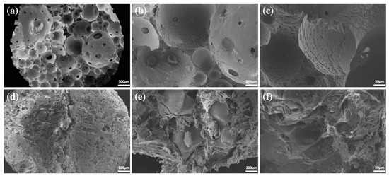 Figure 4. Microscopic structure of block-type and collagen-added BCPs determined via scanning electron microscopy. (a) Block-type BCP image (×100). (b) Block-type BCP image (×300). (c) Block-type BCP image (×1000). (d) Collagen-added BCP image. BCP, biphasic ceramic phosphate scaffold (×100). (e) Collagen-added BCP image. BCP, biphasic ceramic phosphate scaffold (×300). (f) Collagen-added BCP image. BCP, biphasic ceramic phosphate scaffold (×1000).