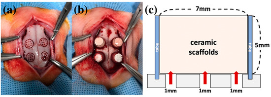 Figure 5. Protocol of animal experiments. (a) Four defects in calvarial area. A round border of 7 mm in diameter with nine holes that were 1 mm in diameter were created. (b) Application of scaffold into polycarbonate tubes (Φ 7 × 5 mm). (c) Schematic of the animal experiment.
