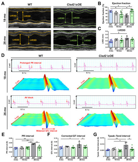 In 18-mo WT mice, echocardiography revealed that their hearts displayed a variety of left ventricular contractile dysfunctions (Figure 2A,B). As the age of the mice advanced from 18 months to 26 months, there was a progressive and significant reduction in the left ventricular (LV) ejection fraction of the naturally aged mice. However, when the Cisd2 icOE mice were examined, the trajectory of LV ejection fraction reduction was reversed after cardiac-specific Cisd2 overexpression at the age of 18 months. Specifically, the LV ejection fraction of the 26-mo Cisd2 icOE mice was significantly elevated after cardiac-specific Cisd2 overexpression. Additionally, age-associated dilation of their cardiac chambers was found in the 26-mo WT mice, which were found to be significantly larger than at 18 months (Figure 2C). Thus, cardiac-specific Cisd2 overexpression was found to prevent age-associated dilatation of cardiac chamber. Moreover, in the old WT mice, a longitudinal analysis of their electrocardiography (ECG, Figure 2D) revealed that during natural aging, there were progressive prolongations of the PR interval (Figure 2E), the corrected QT interval (QTc, Figure 2F), and the Tpeak–Tend interval (Figure 2G) as the age of the mice increased from 18 months to 26 months. Remarkably, in the 26-mo Cisd2 icOE mice, the PR interval, the QTc interval, and the Tpeak–Tend interval were similar to those of the 18-mo mice. Taken together, these echocardiography and ECG findings reveal that the age-associated decrease in the level of cardiac Cisd2 appears to bring about electromechanical dysfunction in the murine heart. Furthermore, and intriguingly, cardiac-specific induction of Cisd2 overexpression at a late-life stage, namely at 18 months of age, can prevent the exacerbation of these disturbances in heart electric conductance associated with aging and it also reverses the decline in contractile capability linked to natural aging.