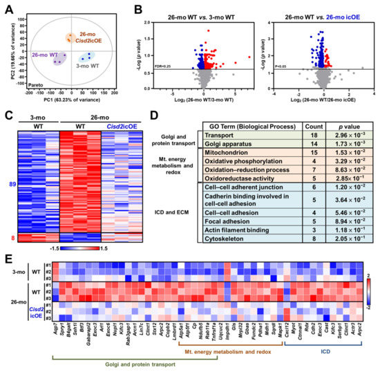 Cardiac-specific overexpression of Cisd2 at late-life stage in Cisd2 icOE mice reverses the cardiac transcriptomic profile changing it from an old-age pattern to a younger pattern. (A) Principal component analysis (PCA) of the RNA-seq data from the three groups of mice, namely 3-mo WT, 26-mo WT, and 26-mo Cisd2 icOE. (B) Volcano plots representing the transcriptomic changes in the 26-mo WT vs. 3-mo WT mice and in 26-mo WT vs. 26-mo Cisd2 icOE mice. The horizontal lines show the 25% false discovery rate (FDR) or the p < 0.05 threshold. Blue dots indicate the downregulated genes and red dots indicate the upregulated genes. (C) Heatmap showing the 97 differently expressed genes (DEGs) that are reverted by the cardiac-specific overexpression of Cisd2 in the Cisd2 icOE mice. (D) Analysis of the Cisd2-reverted DEGs by the GO Biological Processes. (E) Heatmap showing the DEGs involved in Golgi and protein transport, mitochondrial (Mt.) energy metabolism and redox, and ICDs and ECM. ICD, intercalated disc; ECM, extracellular matrix.