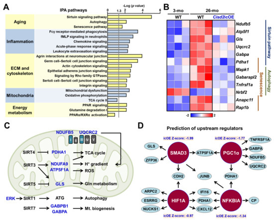 Analyses of the biological functions and pathways of the DEGs reverted by cardiac-specific Cisd2 overexpression. (A) Ingenuity pathway analysis (IPA) of the DEGs. (B) Heatmaps representing the Cisd2-reverted DEGs (26-mo Cisd2 icOE vs. 26-mo WT mice, p < 0.05) related to the sirtuin, autophagy, and senescence pathways. (C) The diagram illustrates the relationships between the SIRT family genes and their related biological functions and the Cisd2-reverted genes. The significant genes reverted by Cisd2 are highlighted with blue color (p < 0.05). (D) The upstream regulators obtained by IPA upstream regulator analysis. The figure was created with BioRender.com.