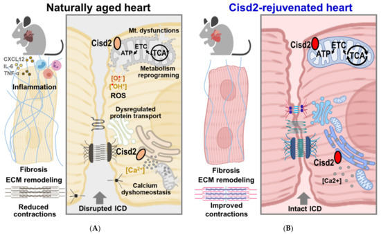 In WT mice at an old age, a decrease in cardiac Cisd2 results in mitochondrial dysfunction, metabolic reprogramming, increased ROS production, dysregulation of proteostasis, and disruption of cytosolic Ca2+ homeostasis. As a consequence, these defects lead to cellular damage to cardiomyocytes, degeneration of ICDs, an increase in interstitial fibrosis, and remodeling of the extracellular matrix together with dysregulation of electromechanical functioning. These functional and structural alterations are accompanied by chronic inflammation during cardiac aging (Figure 6A). In the Cisd2 icOE mice at an old age, cardiac-specific overexpression of Cisd2 at this late-life stage appears to rejuvenate the aging heart via a reversal of the above age-related structural damage and of the disruption to various functions (Figure 6B). Furthermore, we anticipate that in the aging heart, mitochondrion-targeted anti-aging therapy is also brought about by Cisd2 overexpression at an old age via a restoration of the mitochondrial structure as well as of its functions. Consequently, we suggest that this will be accompanied by an increase in metabolic flexibility, a decrease in ROS production, and preservation of cytosolic Ca2+ homeostasis. We believe that all of these changes, taken together, will slow down the aging process in the heart.