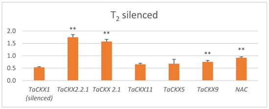Relative values of expression of TaCKX1 and other TaCKX GFMs, and NAC in silenced TaCKX1 lines of T2. The error bars denote ± SE. Significantly different from silenced gene: ** significant at p ≤ 0.01; N 12 (N—number of objects/tested lines).