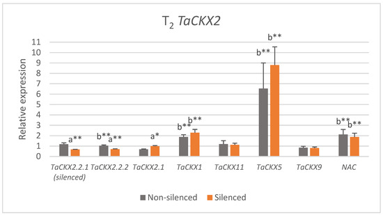 Relative values of expression of TaCKX2 and other TaCKX GFMs, and NAC in silenced and nonsilenced TaCKX2.2.1 lines of T2. The error bars denote ± SE. Different letters mean significant differences: a—between silenced and nonsilenced lines; b—between silenced TaCKX2.2.1 and others. * significant at p ≤ 0.05; ** significant at p ≤ 0.01.