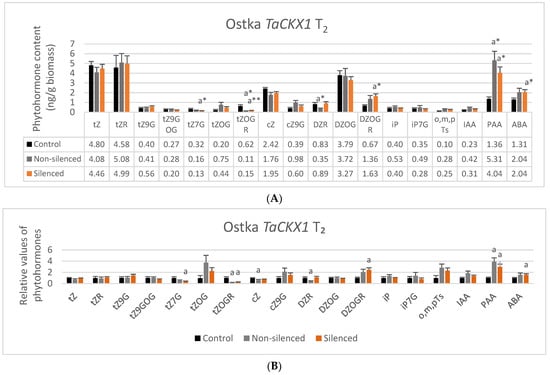Phytohormone content (A) and their relative values (B) in control (black bars), nonsilenced (grey bars) and silenced (orange bars) TaCKX1, T2 lines. Trace amounts (<0.2 ng/g biomass): cZOGR, iPR, o,pTs, BA. Not detected: cZOG, cZR, DZ, DZ9G, DZ7G, IBA, IPA, GA. Error bars denote ± SE. Significant differences between control and nonsilenced or control and silenced lines (a): * significant at p ≤ 0.05; ** significant at p ≤ 0.01. No significant difference between nonsilenced and silenced lines.