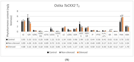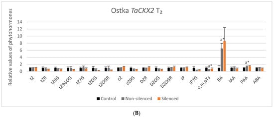 In the case of TaCKX2 silencing, a significant difference was detected between nonsilenced and silenced plants of Ostka in expression level of TaCKX2.2.1 and TaCKX2.2.2. However, there were no significant differences in contents of active, free base cytokinins, tZ, cZ, iP and other phytohormones between the same groups of lines (Figure 4A). Significant differences were only noted for BA and PAA between control and nonsilenced lines. Relative values of BA (Figure 4B) were several times higher in nonsilenced and silenced plants compared to the control. Moreover, PAA was significantly higher and o,m,pTs significantly lower in nonsilenced compared with the control lines.