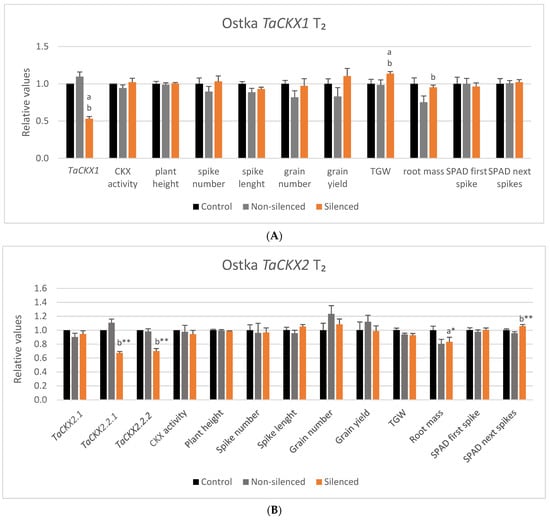 Relative values of TaCKX1 expression and yield-related traits in TaCKX1 (A) and relative values of TaCKX2.1, 2.2.1 and 2.2.2 expression and yield-related traits in TaCKX2 (B) silenced (orange bars), nonsilenced (grey bars) and control (black bars) of T2 lines. Error bars denote ± SE. Significant differences between control and silenced (a) and nonsilenced and silenced (b): * significant at p ≤ 0.05; ** significant at p ≤ 0.01.