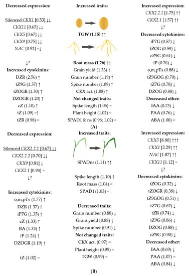 Schematic presentation of effect of TaCKX1 (A) and TaCKX2 (B) silencing on coregulation of expression of other TaCKX GFMs and phytohormone contents and yield-related traits. […] relative expression to the control; (…) RI silenced or nonsilenced; ↑↑, ↓↓ significantly increased, decreased; ↑, ↓ increased, decreased nonsignificantly.
