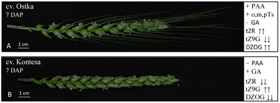 These differences in composition and content of phytohormones in 7 DAP spikes of both wheat cultivars are probably reflected in their different phenotypes. The most visible are awned spikes in Ostka and awnless spikes in Kontesa. As reported, wheat awns play an important role in photosynthesis, grain production, and drought tolerance [,], and awnless wheats produce more grains per spike, but their size is reduced compared to awned ones []. The authors suggested that allocation of assimilates to rapidly developing awns decreased spikelet number and floret fertility, and in consequence, grain number. Regulation of awn length and grain production by cytokinin metabolism was documented in rice by the An-2 gene. The gene encodes Lonely Guy Like protein 6, which catalyzes the final step of cytokinin synthesis in O. rufipogon []. It is feasible that these new compounds of the hormonal pool in 7 DAP spikes of Ostka, PAA and topolins, are the main regulators of awns, which should be further tested.
