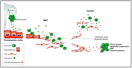 At the initial steps of peritoneal metastasis, OvCA cells directly encounter the monolayer formed by PMCs. Until recent years, it was believed that PMCs only acted as a passive mechanical barrier, avoiding tumor cell adhesion and invasion in the peritoneum and, as a consequence, preventing the formation of secondary tumor nodules into the submesothelial peritoneal stroma [79]. However, more recently, it has been reported that PMCs exert an active role in establishing a pre-metastatic niche required for the subsequent colonization of the peritoneum [80]. As in any distant metastatic process, peritoneal colonization requires the previous education of a pre-metastatic niche, a peritoneal microenvironment that favors the subsequent OvCA cell invasion through the submesothelium. PMCs are considered the principal recipient target cells for a wide range of molecules packed in oncosomes, which are initially released to the peritoneal cavity from the primary tumor site. On this note, Yokoi et al. proposed a mechanism of apoptotic PMC death via OvCA-produced extracellular vesicles carrying MMP1 mRNA [74]. Undoubtedly, the destruction of the peritoneal mesothelium barrier facilitates the establishment of metastatic implants into the peritoneal stroma. Nevertheless, in the context of peritoneal metastasis, PMCs can be converted into CAFs through an MMT process [13,14,15]. In this regard, an increasing number of reports point to oncosomes as key mediators of peritoneal metastasis through the mesenchymal reprograming of PMCs [81,82]. In fact, Wei et al. revealed the expression of specific fibroblast markers, including fibroblast activation protein (FAP) and alpha-smooth muscle actin (α-SMA), in PMCs upon in vitro and in vivo treatments with malignant ascites-derived exosomes [81].