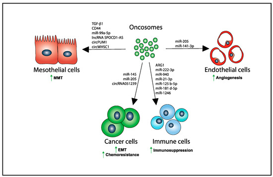 Macrophages are another immune cell that plays an important role in the establishment of the pre-tumoral niche, and, in fact, they are the major type of immune cell present in the tumor environment. They can display either a pro-inflammatory (M1) or an anti-inflammatory phenotype (M2), and many studies have shown that tumor-associated macrophages are typically polarized toward an M2-like phenotype and play a crucial role in the progression of the tumor [109,110]. These cells can produce and release several molecules, such as TGFβ-1, VEGFA, IL-4, IL-5, or IL-6, that suppress the adaptive immune response and promote tumor cell survival and proliferation, invasion, and metastasis. Some studies have demonstrated that several miRNAs contained in oncosomes, such as miR-222-3p, miR-940, miR-21-3p, miR-125 b-5p, miR-181 d-5p, or miR-1246, induce the polarization toward M2 macrophages [109,110,111].