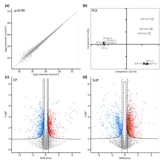 Following cell harvest, cell pellets (CP) and supernatants (SUP) were prepared for proteome analysis using a modified version of the SP3 protocol. As indicated for control samples by the scatter plot in Figure 2a, automatic handling of magnetic beads used for sample preparation in combination with high resolution LC-MS instrumentation yielded excellent reproducibility. Generally, duplicate analysis of biological replicates resulted in a Pearson correlation coefficient of >0.99. Following filtering of the data for a minimum of two unique peptides per protein and 70% valid values per group, remaining missing values were imputed based on a standard distribution. Further statistical analysis by means of principal component analysis (PCA, Figure 2b) revealed a clear differentiation between transfected and control samples. Interestingly, the effect was more evident in SUP samples, which might be due to differences in the complexity of those samples. Nevertheless, sample groups derived from CP also clearly segregated, especially when analyzed separately (not shown), while biological replicates clustered, again demonstrating high reproducibility.