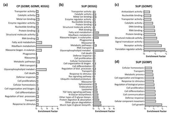Results of gene ontology (GO) enrichment analysis using a Fisher’s exact test with a p-value threshold of 0.05 performed in Perseus (version 1.6.6). Shown are enriched Kegg pathways, GO molecular functions (GOMF), and GO biological processes (GOBP) in cell pellet samples (CP, (a)) as well as supernatant samples (SUP, b–d).