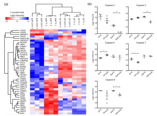 Hierarchical clustering of significantly differentially expressed proteins involved in endocytosis (a) based on Euclidian distance. Shown are log2-intensities after z-transformation. Red indicates upregulation while blue shows downregulation of the corresponding proteins. (b) Log2-transformed LFQ intensity of identified caspases. Significance was determined using an ANOVA with a Tukey’s post-test (*** p ≤ 0.001; ** p ≤ 0.01; * p ≤ 0.05; n = 3).