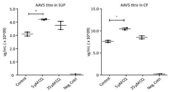 AAV5 concentration in viral genomes per mL (mg/mL) 72 h post-transfection following chloroquine (QC) treatment. Shown are titers measured via qPCR in cell culture media (SUP, left) as well cell pellets (CP, right). Significance was determined using a two-tailed t-test comparing treated samples vs. control (* p ≤ 0.05; n = 3).