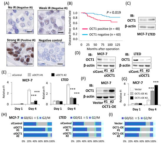 In this study, we investigated the clinical value of Octamer transcription factor 1 (OCT1) in ER-positive breast cancer. OCT1 is a transcriptional factor that is also known as POU domain class 2 transcription factor 1 (POU2F1). It binds specifically to the octamer consensus sequence (ATGCAAAT) in the promoter region of the DNA of the target genes and regulates their transcription []. Acyl-CoA synthetase long chain family member 3 (ACSL3) [], disks large-associated protein 5 (DLGAP5) [], anillin actin binding protein (ANLN) [], and cyclin D1 (CCND1) [], which are involved in cell proliferation, were reported as target genes. In addition to these genes, several genes related to various functions, such as cellular stress response, metabolic regulation, and cancer metastasis, have been reported as OCT1-target genes [,,,,,].