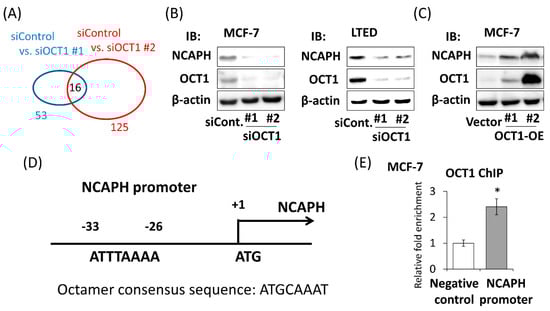 The following are available online at https://www.mdpi.com/article/10.3390/ijms222111505/s1, Table S1: Sixteen genes commonly regulated by siOCT1 #1 and siOCT1 #2 in MCF-7 cells, Figure S1: Specificity of anti-OCT1 antibody, Figure S2: Analysis of OCT1 expression using public database, Figure S3: OCT1 expression in breast cancer cells, Figure S4: OCT1 promotes cell proliferation and induces the cell cycle transition from G1 phase to S phase, Figure S5: Kaplan–Meier survival analysis of breast cancer patients for candidate OCT1-target genes identified in the present study, Figure S6: Specificity of anti-NCAPH antibody, Figure S7: NCAPH expression in breast cancer cells, Figure S8: Knockdown of NCAPH inhibited the cell cycle transition from G1 phase to S phase, Figure S9: Overexpression of NCAPH rescued the suppressed cell cycle transition from G1 phase to S phase by siOCT1.