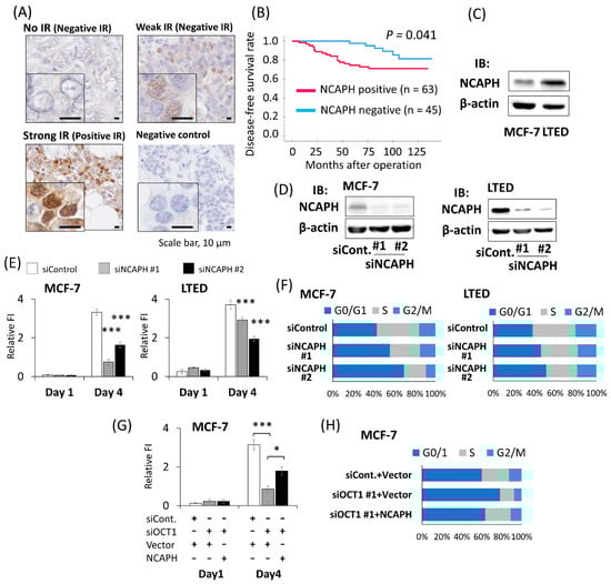 To explore the clinical value of NCAPH expression in ER-positive breast cancer, immunohistochemical analysis was performed with the same 108 female breast cancer patients as in the analysis of OCT1. Prior to immunostaining, the specific reactivity of the antibody against NCAPH was confirmed by Western blotting using cell lysate derived from HEK293 cells and MCF-7 cells overexpressing human NCAPH (Figure S6). NCAPH staining was observed in both the nucleus and in the cytoplasm. In some cases, the nuclei were prominently stained (Figure 3A). NCAPH IR was significantly positively associated with OCT1 status (p < 0.001) (Table 3). In terms of relationship between NCAPH IR and clinical prognosis, positive NCAPH IR was significantly associated with a shorter DFS (p = 0.041) (Figure 3B). Univariate analysis using the Cox proportional hazard model demonstrated that NCAPH status, invasive tumor size, lymph node status, and nuclear grade were significant prognostic factors for DFS. Multivariate analysis of these factors showed that NCAPH status and invasive tumor size were independent prognostic factors (Table 4). These immunohistochemical results were in line with the prognostic analysis conducted using KM plotter (Figure S5C). According to the expression analysis using Oncomine, the NCAPH mRNA expression level was significantly increased in the invasive ductal breast cancer tissues compared to in normal breast tissue (Figure S7E). Then, we compared endogenous NCAPH expression in the human breast cancer cell line MCF-7 and LTED cells. Both the mRNA and protein expression levels in LTED cells were higher than those in MCF-7 cells (Figure S7F and Figure 3C).