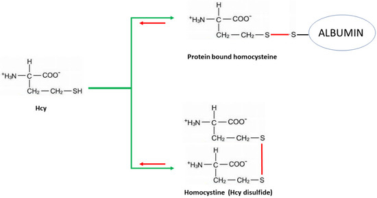 Homocysteine (Hcy), a non-protein, sulfur-containing amino acid (see chemical structure reported in Figure 1) is the demethylated methionine derivative, occurring in the methionine-homocysteine cycle. Although, as an amino acid, Hcy is endowed with the presence of both one amino and one carboxyl group, it is not utilized in protein biosynthesis because it is not encoded by any codon-anticodon system. It is important to mention that, due to its high pKa, the free sulfidryl group on the Hcy side chain is easily oxidized at a physiological pH [11]. Hence, because of the strong reactivity of this thiol group, only about 1 ÷ 2% of Homocysteine is usually present in its free reduced form. Conversely, most of Hcy is carried in circulation in the form of a heterodimer that is mostly bound to the cysteine of serum albumin, while only a minimum is in the homodimer protein-free form (homocystine). Homocystine-mixed disulfides with free homocysteine or cysteine represent less than 15% of the total Hcy in serum. The Hcy-protein covalent disulfide adduct is by far the most abundant (for instance, at least 80% of homocysteine is bound to albumin) (Figure 1).