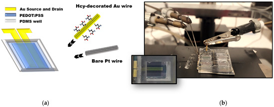(a) Sketch of the OECT layout with Hcy-decorated Au- and bare Pt-gated electrodes used in this study. (b) Photograph of the OECT device connected to the probe-tip terminals (source and drain), showing the liquid electrolyte confined in the PDMS well and the Hcy-decorated gold gate electrode immersed in it; the inset shows a top-view picture of the real OECT.