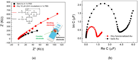 Figure 3b highlights the difference in total capacitance for Hcy-covered and bare gold electrodes and allows the estimation of the total capacitance at the bare gold electrode (calculated as the intercept value between the real axis and the semicircle [29]), which is about 4 µF. Although such representation is controversial and tricky in terms of estimating the double layer capacitance in cases of defective real coatings described by modified Randles equivalent circuits, the Nyquist plot, reported in Figure 3a for the Hcy-covered Au electrode, qualitatively indicates that its total capacitance is enhanced (i.e., it is expected to be higher than 4 µF).