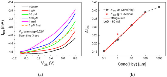 Transfer characteristics, i.e., channel current (IDS) as a function of the gate voltage (VGS), were recorded accordingly using 2-channel source meter precision unit (B2902A, Keysight Technologies, Santa Rosa, CA, USA) by fixing the channel voltage (VDS) at −0.1 V and varying the VGS between −0.1 V and 0.8 V (scan rate ΔVGS = 0.02 V; scan time t = 3 s). One batch of PBS was used as a gate electrolyte. After each measurement, the device channel was rinsed three times in MilliQ water, with the aim of removing the residual saline content from the channel and, consequently, restoring the initial IDS current value. The sensing performance was evaluated using the modulation parameter ΔIDS, defined as [(IDS(@VGS = 0.8) − (IDS(@VGS = −0.1)]/(IDS(@VGS = −0.1). From the ΔIDS vs. Hcy concentration curve, the Limit of Detection (LoD) was assessed as: LoD = 3σ/S, where σ is the standard deviation of the response (i.e., the standard deviation of the y-intercept of the regression line) and S is the slope of the regression line.