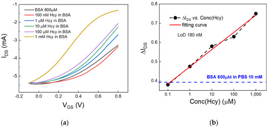 Hcy-based solutions, consisting of Hcy dissolved at various concentrations (from 100 nM to 1 mM) in a physiologic-like microenvironment made of a PBS:BSA (10 mM:600 µM), were used as gate electrolytes for Pt-gated OECTs. Since the neutral electrolytic environment favors the reactivity of the thiol group, oxidative reactions between albumin and Hcy were expected to promote Hcy–BSA binding to a large extent and in a rapid manner [25]. Therefore, the Pt-based OECTs operated in a simil-physiological microenvironment made of some free Hcy and an excess of albumin (BSA–Hcy). The resulting transfer curves are reported in Figure 5a. Interestingly, increasing levels of BSA-Hcy in the electrolytic solution were found to promote an enhanced IDS current modulation.