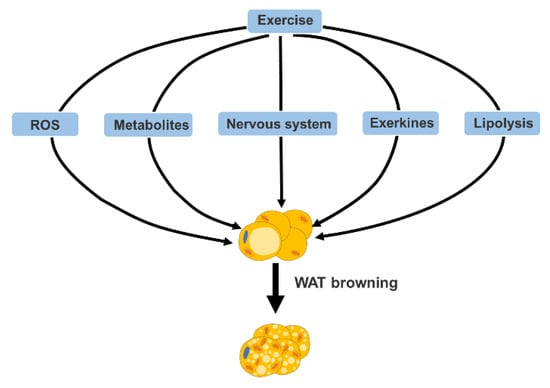Mechanism of exercise-mediated WAT browning. Multiple factors, including reactive oxygen species (ROS), metabolites, nervous system, exerkines and lipolysis can facilitate exercise-mediated browning of WAT.