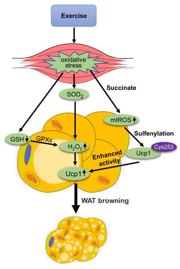 Evanna L. Mills et al. [21] found that treating mice with succinate led to increased ROS levels in adipose tissue. They found that succinate oxidation, via the succinate dehydrogenase (SDH), increases ROS production in adipose tissue. After SDH inhibition, succinate-dependent ROS increase was eliminated. Interestingly, it was found that acute exercise increases succinate levels in skeletal muscles. Anita Reddy et al. [22] examined the tibialis anterior muscle of mice following an acute exercise intervention and found increased succinate levels. Moreover, after 60 min of cycling training, healthy men had increased levels of succinate in their blood. Thus, it is hypothesized that exercise-mediated up-regulation of succinate could stimulate the increase of mtROS in adipose tissue and promote Ucp1-activity by the sulfenylation of Ucp1 (also see the discussion in the next section).