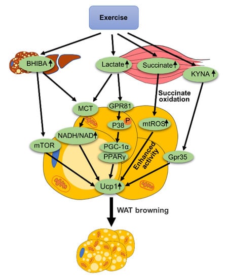 Exercise can mediate the production of many metabolites, such as lactate, ketone bodies, succinate and kynurenic acid (KYNA). These metabolites produced by exercise can lead to the browning of WAT, as is summarized in Figure 3.