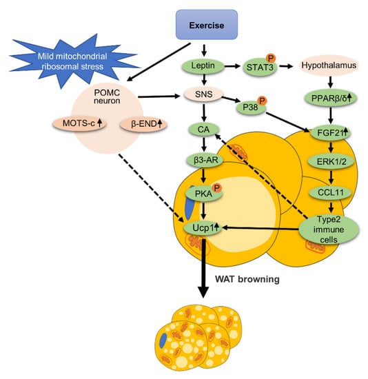 The nervous system is involved in the exercise-mediated browning of WAT, as is summarized in Figure 4. An experiment [32], explains the relationship between exercise-mediated browning of WAT and proopiomelanocortin (POMC) neurons. It was shown that inducing mild mitochondrial ribosomal stress in POMC neurons, as indicated by the elevated expression of β-endorphin (β-END) and the mitochondrial open reading frame of the 12S rRNA-c (MOTS-c), would cause a series of beneficial metabolic effects. After POMC neurons were stressed, the mRNA expression levels of Cidea1 and Ucp1 in iWAT were significantly increased. The researchers demonstrated that exercise is a physiological condition that stimulates mild mitochondrial ribosomal stress in POMC neurons. In this experiment, mice were subjected to a running program for two weeks. The running speed was 13 m per minute for 50 min a day. The results showed that moderate-intensity exercise can increase mild mitochondrial ribosomal stress of POMC neurons in the hypothalamus, which is involved in promoting the browning of iWAT. In addition, the authors also mentioned that POMC neurons with mild mitochondrial ribosomal stress may promote innervation of the SNS to stimulate WAT heat production and browning.