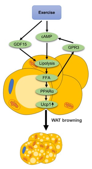 Attention has been aroused by a recent experiment [51]. The experiment proposed that the relationship between lipolysis and WAT browning may be attributed to the existence of G protein-coupled receptor 3 (GPR3). GPR3 does not require ligand activation, and when GPR3 integrates into the cell membrane, it can automatically activate downstream signals. The experiment pointed out that the high expression of GPR3 in WAT will promote the browning of WAT. Interestingly, the lipolysis signal directly promotes the expression of GPR3, thereby promoting thermogenesis. Most importantly, this has also been confirmed in human experiments. Increasing the level of GPR3 in human subcutaneous white adipocytes induced the expression of thermogenesis gene Ucp1, mitochondrial respiration and fatty acid uptake. Therefore, the lipolysis signal directly promotes the expression of GPR3, thereby promoting the expression of Ucp1 genes and proteins and facilitating WAT browning. In addition, free fatty acids (FFAs) produced by lipolysis can act as ligands of PPARα. Once activated by FFAs, PPARα promotes the expression of thermogenic genes such as Ucp1. As a result, a conjecture is proposed: exercise promotes lipolysis, which triggers a GPR3 signal or produces FFAs to activate PPARα, thereby promoting the browning of WAT. This may be a possible mechanism underlying exercise-induced WAT browning and merits further investigation.