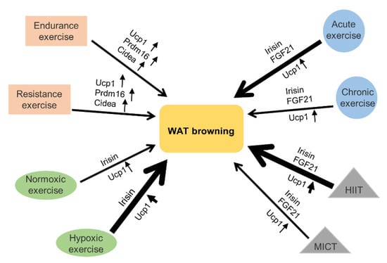 Effects of different exercise programs on the browning of WAT: various types of exercise, including high-intensity interval training (HIIT), moderate intensity continuous training (MICT), acute exercise, chronic exercise, normoxic exercise, hypoxic exercise, aerobic exercise and resistance exercise can mediate the browning of WAT. Among them, HIIT can promote WAT browning more effectively than MICT. Acute exercise can promote WAT browning more effectively than chronic exercise. Hypoxic exercise can promote WAT browning more effectively than normoxic exercise. The expression levels of browning-related genes, such as Ucp1, Prdm16 and Cidea are up-regulated in WAT after many different types of exercise. Irisin and FGF21 are involved in promoting WAT browning and are mediated by many different types of exercise. The thickness of the arrow indicates the strength of the effect exerted by exercise. The thicker the arrow is, the stronger the effect is.