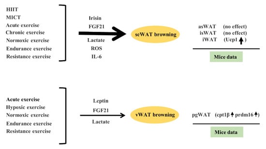 Studies have shown that adipose tissue in different parts of the body could have different browning effectiveness in response to exercise (Figure 8). As mentioned above, both HIIT and MICT can induce the browning of scWAT. Acute exercise mediated the browning of scWAT and vWAT. In contrast, chronic exercise mediated browning in scWAT rather than vWAT. Hypoxic exercise may mediate browning in vWAT, which is more difficult to brown than scWAT and normoxic exercise can mediate scWAT and vWAT browning. In addition, both endurance exercise and resistance exercise can mediate scWAT and vWAT browning. Adam C et al. [67] studied the responses of different adipose tissue depots to exercise in mice. In the scWAT of mice, exercise training did not affect the expression of the beige gene in anterior subcutaneous WAT (asWAT) and interscapular WAT (isWAT), but it increased the expression of the Ucp1 gene and protein in iWAT. In the visceral adipose tissue of mice, exercise training increased Cpt1β and Prdm16 gene expression in perigonadal WAT (pgWAT) but did not affect Ucp1 or Cidea.