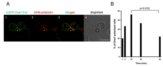 Redistribution of mGFP-Orai1-Full into the IS. Representative confocal images of the immune synapse formation between Jurkat cells expressing mGFP-tagged Orai1-Full channel and CD3-CD28 antibody coated beads. (A1) mGFP-tagged Orai1-Full channels are shown in green. (A2) Alexa-546 phalloidin stain of Jurkat cell (red) is shown (an IS formation indicator). (A3) Merged image of Orai1 (green) and Alexa-546 phalloidin (red) fluorescence signals. (A4) Brightfield image of mGFP-Orai1-Full channel expressing cell in Aa-Ac. The bead is indicated with an asterisk. Scale bar is 10 µm. (B) The percentage of cells showing polarized Orai1-Full expression upon the IS formation with CD3-CD28 antibody coated beads at 1st, 5th, 15th, 30th and 60th minute. 30 cells were analyzed at each time point.