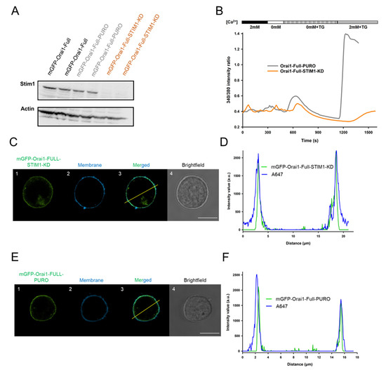 Knockdown of STIM1 in Jurkat cells expressing mGFP-Orai1-Full resulted in nonfunctional channels. (A) Western blot experiments of mGFP-Orai1-Full expressing Jurkat (black), mGFP-Orai1-Full-PURO (grey) and mGFP-Orai1-Full-STIM1-KD (orange) cells probed with a specific antibody against STIM1 (the expected size 85–88 kDa, each sample was loaded in duplicates). Actin antibody was used as an expression control with an approximate size of 42 kDa. (Knock-down efficiency was ca. 95%.) (B) Cytosolic Ca2+ measurements using FURA-2 in mGFP-Orai1-Full-PURO cells stably expressing mGFP-Orai1-Full channels (grey) and in Jurkat cells missing the Orai1 activator STIM1 protein (mGFP-Orai1-Full-STIM1-KD) stably expressing mGFP-Orai1-Full channels (orange). Cytosolic Ca2+ measurement based on the 340 nm/380 nm intensity ratio of FURA-2. The representative traces are the average of 18 cells (mGFP-Orai1-Full-PURO) and 8 cells (mGFP-Orai1-Full-STIM1-KD). (C) Typical confocal images of mGFP-Orai1-Full-STIM1-KD cells. (C1,E1) mGFP signal of Orai1-Full channel in STIM1-KD or PURO cells (green), (C2,E2) The Alexa Fluor™ 647 NHS Ester fluorescence of the plasma membrane (blue) in mGFP-Orai1-Full-STIM1-KD and mGFP-Orai1-Full-PURO cells. (C3,E3) The merge of green and blue channels in mGFP-Orai1-Full-STIM1-KD and mGFP-Orai1-Full-PURO cells, please note the overlapping of them. (C4,E4) Brightfield image of the mGFP-Orai1-Full channel expressing STIM1-KD or PURO cells in Ca-Cc or Ea-Ec. Scale bar is 10 µm. (D,F) The pixel-by-pixel intensity profile analysis of the mGFP-Orai1-Full-STIM1-KD and mGFP-Orai1-Full-PURO cell along the line indicated in the merged image (C3,E3): green: mGFP-Orai1, blue: membrane, Alexa-647 NHS ester.