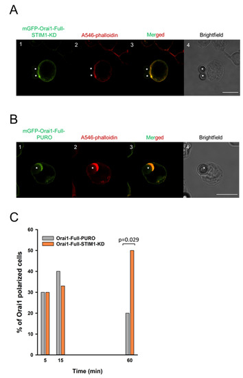 Afterwards, time-dependence of IS-accumulation for Orai1 channels in mGFP-Ora1-Full-PURO and mGFP-Ora1-Full-STIM1-KD cell lines was determined. As detailed above, we generated IS between these two cell lines and CD3/CD28 antibody coated beads at three time points (5th, 15th and 60th minute) as before (shown in Figure 3A,B) and evaluated the fraction of cells displaying Orai1 IS-redistribution (and showing F-actin polarization at the bead-cell contact area). The time course of the Orai1 IS-accumulation for mGFP-Orai1-Full-PURO cells (Figure 3C) was similar to mGFP-Orai1-Full construct expressing cells (Figure 1B): percentage of Orai1-polarized cells peaked at 15 min (app. 40%) and dropped to ca. 25 percent just as seen for WT-Orai1. However, STIM1 knockdown modified the kinetics of Orai1 IS redistribution: the fraction of cells showing Orai1 accumulation in the IS increased up to 60th minute in mGFP-Orai1-Full-STIM1-KD cells (Figure 3C, p = 0.029). AR values for these mGFP-Orai1-Full-PURO and mGFP-Orai1-Full-STIM1-KD were also statistically different (p = 0.015, Figure S6).