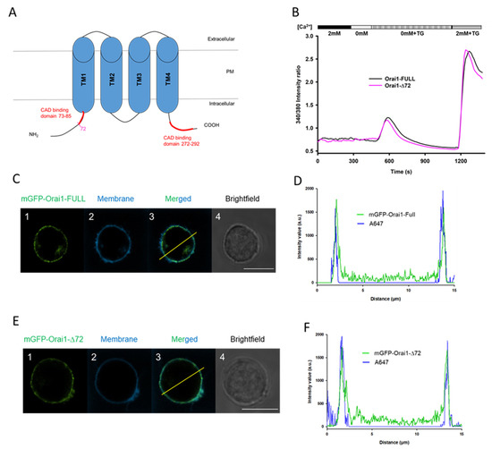 Next, we assessed the cellular localization of mGFP-Orai1-Δ72 construct in Jurkat cells: plasma membrane was stained with Alexa-647 succinimidyl ester and the line intensity profile was determined for the truncated channel expressing cells. Figure 4D,F clearly confirm the plasma membrane localization of Orai1 channel constructs: intensity profile analysis shows that intensity peaks of Alex647 staining (membrane labeling) and the mGFP-signal overlap just as for the wild-type Orai1 (see Figure 4C,E). Consequently, mGFP-Orai1-Δ72 channels are able to target the cell membrane.