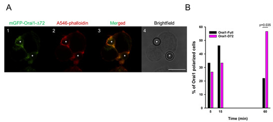 The C terminus of Orai1 subunit is essential for STIM1 coupling and SOCE activation, and N-terminal region contains a CAD binding domain that is necessary for the Ca2+ permeation [20,36,37,38,39]. Therefore, we created an N-terminal mutant named mGFP-Orai1-∆72 (mimicking Orai1β isoform and preserving N terminal binding of STIM1 partly), where the first 72 amino acids were removed to unveil the role of the intracellular amino-tail in the reorganization to the IS (Figure 4A).