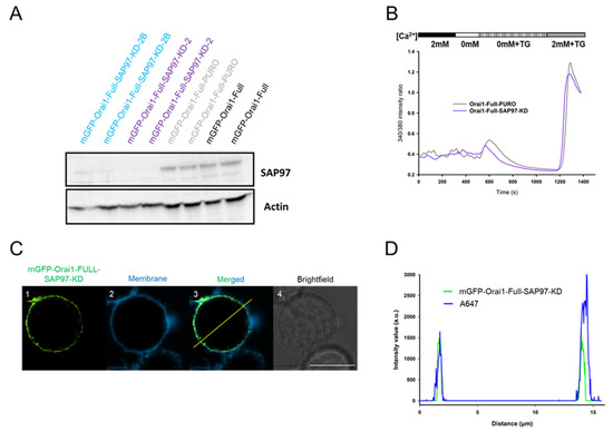 Experiments with mGFP-Orai1-Full-PURO, mGFP-Orai1-Full-SAP97-KD and mGFP-Orai1-Full-STIM1-KD cells were performed in parallel.